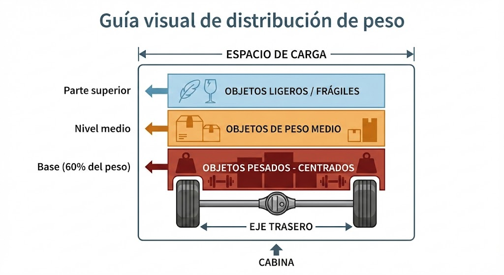 - Parte delantera y trasera: El 60% del peso debe ir en la mitad delantera del espacio de carga